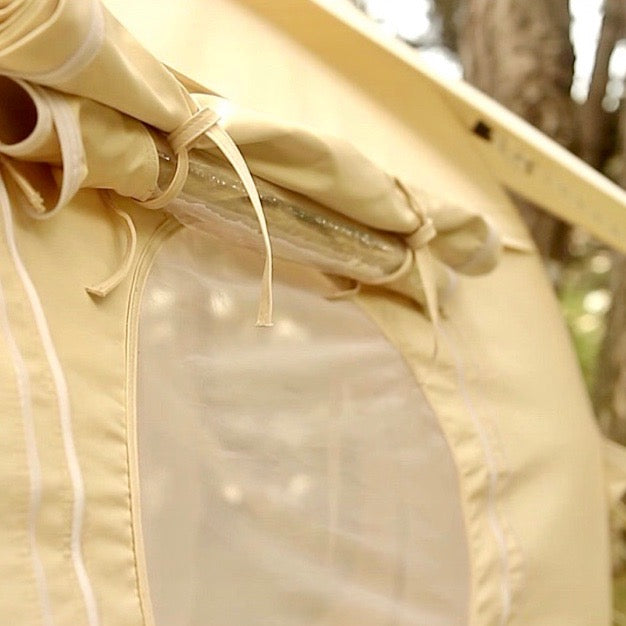 Vero campeggio VIP con un sacco di comfort per i giorni caldi e freddi. Il modello Lotus Belle Hybrid Deluxe ha due porte di apertura e può essere collegato opzionalmente ad altre yurte o tende di lusso. Grazie alle finestre in PVC, le tende esterne non hanno bisogno di essere chiuse in caso di vento e pioggia e lasciano entrare la luce senza perdita di calore. Ideale per 2-4 persone.